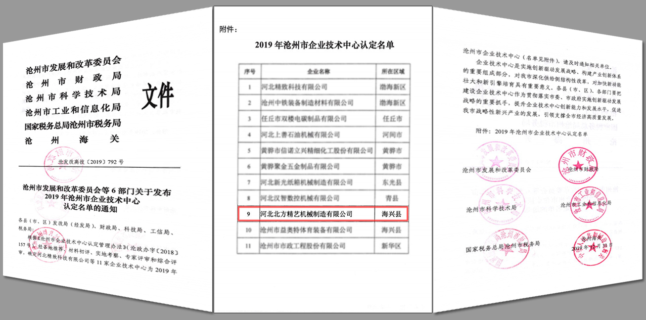 ? ? ? ? 在經(jīng)過(guò)嚴(yán)格的材料評(píng)審、實(shí)地考察、專(zhuān)家答辯和綜合評(píng)審,河北北方精藝機(jī)械制造有限公司最終榮獲由滄州市發(fā)展和改革委員會(huì)、滄州市科學(xué)技術(shù)局、滄州市工業(yè)和信息化局等共六個(gè)部門(mén)共同認(rèn)定的“滄州市企業(yè)技術(shù)中心”。