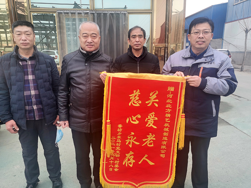 ? ? ? ? 近日,香坊鄉(xiāng)東馬村村長(zhǎng)及黨支部書(shū)記等一行三人將書(shū)有“關(guān)愛(ài)老人,慈心永存”的錦旗送至河北北方精藝機(jī)械制造有限公司總經(jīng)理馬風(fēng)順先生手中,以表達(dá)該村村民對(duì)北方精藝愛(ài)心捐物的善舉表示感激之情。